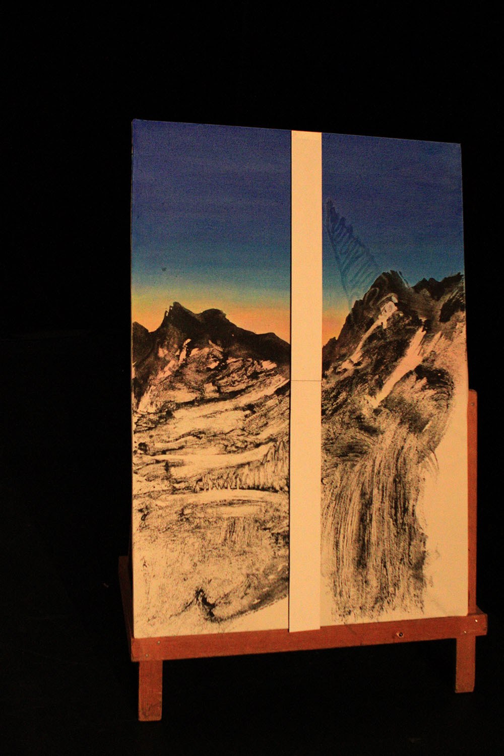 Edna Kurtz Emmet showcases paintings made with black sand and glow-in-the-dark paint – viewed with lights both on and off.