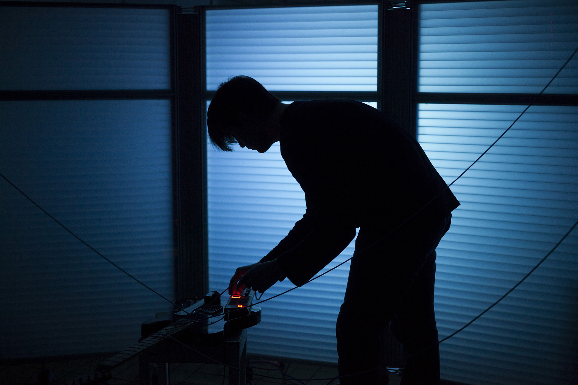 These works engage different issues of sound and space through variations of technology, illumination, and interactivity. The two performance pieces "slaggrinding" and "bulk modulus" feature an unusual apparatus of glitchy software, neon paracord and strained gestures, while "eismatrix[0]" offers a participatory paradigm in which attendees interact with and contribute to the work through their own presence and creative reactions.