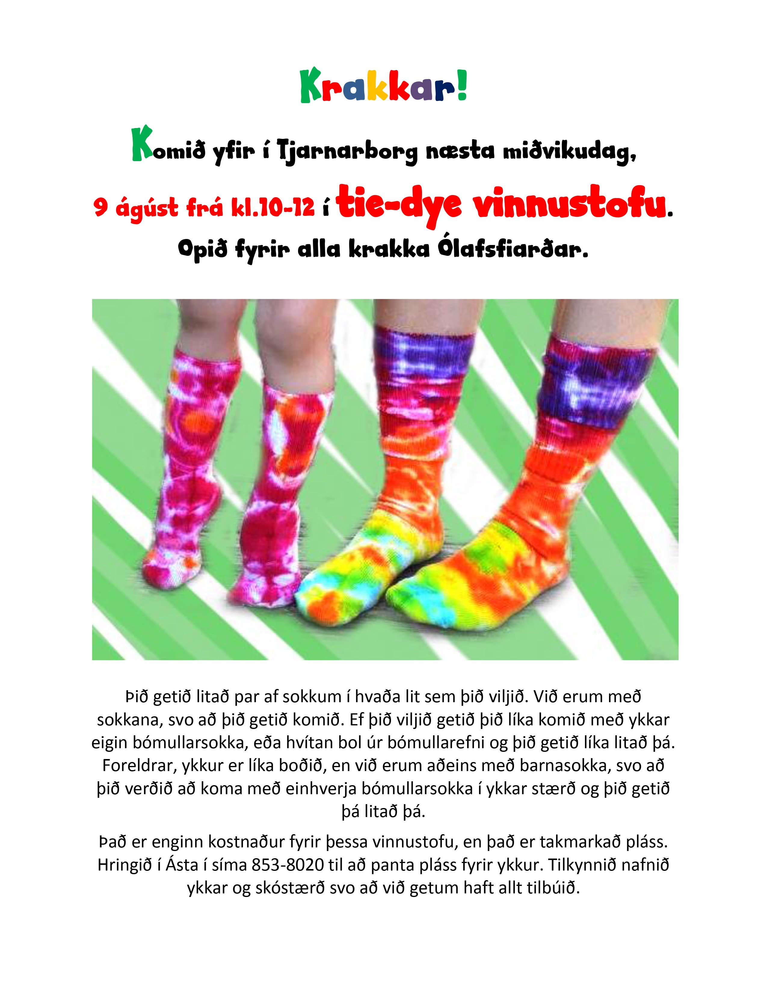 You can color pairs of socks in any color you want. We have stockings, so you can come. If you want, you can also bring your own cotton socks, or a white cotton ball and you can also color them. Parents, you are also invited, but we only have baby socks, so you have to bring some cotton socks to your size and you can then color them. There is no cost for this studio, but there is limited space. Call Ásta on phone 853-8020 to reserve space for you. Announce your name and sign in so we can make everything ready.